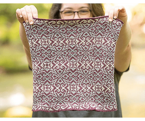 The shapes water naturally freezes in as it meets a windowpane or pushes up through clay are both beautiful and fascinating: spiky edges combine into gorgeous swirling patterns. Frostblossom is the perfect cowl for keeping you warm while admiring the beauty winter has to offer! The cowl starts and ends with stockinette facings–turning these under and sewing them to the back results in a tidy, slightly flared edge, allowing the front of the cowl to consist entirely of the allover stranded design.