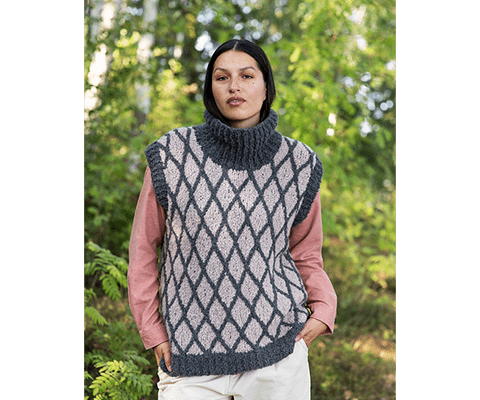 This textured vest is knitted from the bottom up. It is worked flat, in pieces and features stranded colourwork and 1/1 cables. After seaming both sides and the shoulders, stitches are picked up for the neckband and armbands.