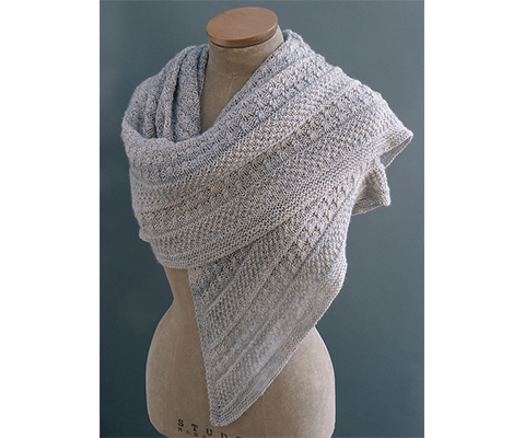 This highly textured shawl was inspired by the many lichens and mosses that grow in Wales. Lichen stitch is paired with moss stitch bands, which are accentuated by reverse stocking stitch. These contrast with the wide central garter stitch panel. This makes an interesting, yet easy knit for the advanced beginner. A versatile shawl in 2 sizes, that can be worked in a variety of yarns from fingering through to worsted weight. It is best worked in a solid yarn to show the textured patterns well.