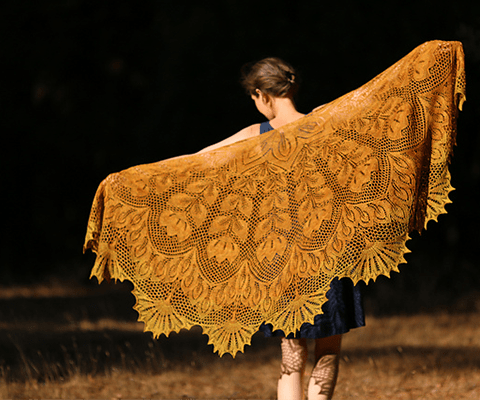 Lothlorien is a lace and mesh semicircular shawl with botanical elements drawn from the work of the phenomenal Herbert Niebling, and evoking echoes of Tolkien’s Lord of the Rings description of the woods of Lothlorien, with its floor of golden leaves, and roof of golden boughs laden with yellow flowers.