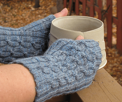 These fingerless mitts feature a lovely knotted cable pattern interacting with basic ribbing. The resulting fabric is close-fitting yet comfortable. The stretchy fabric will accommodate a variety of hand sizes although fit can be further adjusted by changing needle size.