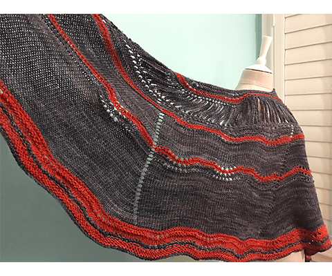 Per Se is the perfect shawl for hand dyed yarn when you want to make a statement. A simple stitch pattern creates gentle waves over a field of stockinette, set off by contrasting stripes. Cleverly designed vertical spindles around the upper section provide a unique focal point sure to catch the eye.