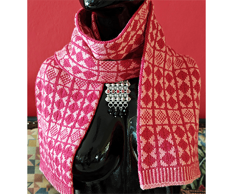Sanquhar patterns are typically knit in two colors – often black and white – although I’ve chosen the red and pink colors for a more contemporary look. The scarf is knit in the round as a tube, and as only two colors are used on any round it makes for a relatively simple, yet interesting project. The scarf is finished by blocking the piece flat and then sewing each of the ends closed.