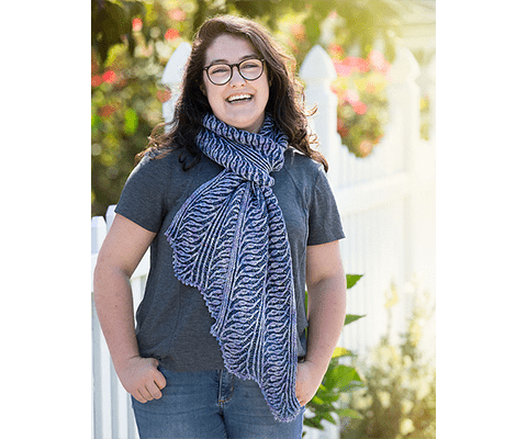 This two-color brioche scarf uses a careful arrangement of increases and decreases on just one pattern row to make a bold organic design. A picot cast-on and bind-off give the scalloped ends a little extra flair.