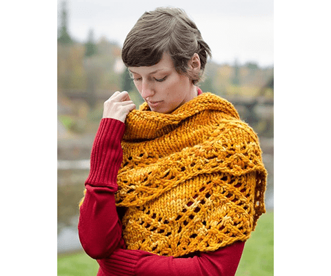 Thick and cozy, Sentiment is soft as a cloud, yet warm as a wool blanket. Heavy yarn makes it a quick knit, and the easy lace pattern is perfect for those newer to lace. Be as bold and dramatic as you like: nothing cheers up a cold winter’s day like bright color!