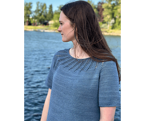 Starburst Tee is the perfect top to knit up fast for warmer weather or to layer under a sweater or jacket. It’s simple elegance with a lacy sunburst at the top. Picture it over a linen skirt, shorts, summer pants, or your favorite jeans.
