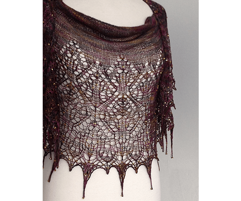 There is nothing sinister or scary about this knit at all – a fun and easy knit with no wrong side patterning but with lots of interest, lots of beads and lots of character! This delicate and dramatic lace shawl is a wide and shallow crescent that gets more heavily beaded as you progress through the pattern and your shawl is finished with a finale of a dramatic and exciting lace edge.