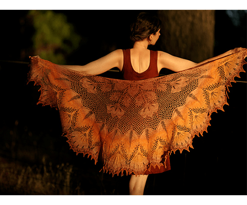 Windflower is a textured lace & mesh semicircular shawl with botanical and architectural elements evocative of other times & places. The design begins with detailed anemones (also called windflowers), enclosed by an arch of hydrangea leaves opening into intricate lilies.