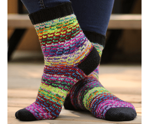 These socks feature fun and intuitive patterning with alternating rounds of colourwork and solid colours, making it possible to use each individual colour for as few as three rounds before moving on to the next scrap. The left and right charts are mirror images, and corresponding written instructions are provided. They feature a contrast toe, cuff, and comfortable rounded Chinstrap heel.