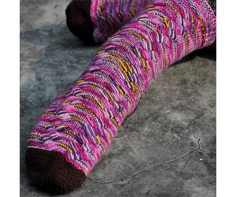These socks use stacked cables of elongated stitches to create a truly unique surface texture on top of the fabric. I promise it is much more intuitive than it might look! All cables can be easily done without a cable needle. Both toe-up and cuff-down instructions are provided.They feature a Chinstrap three-wedge short row heel and a twisted-rib cuff. The toe and heel are worked in a complementary contrast colour. Optional mini-gusset instructions are included for a customizable fit over the instep.
